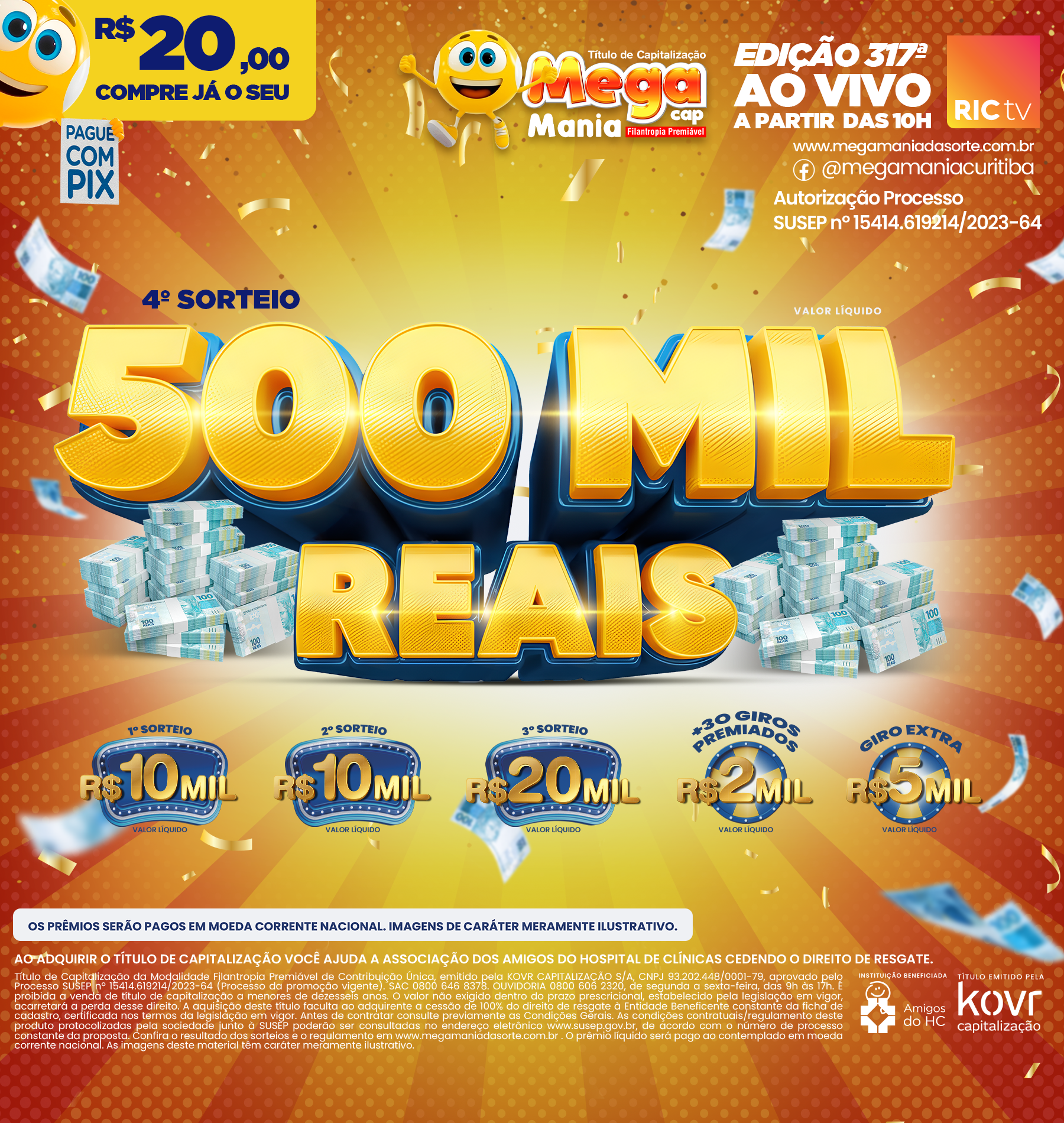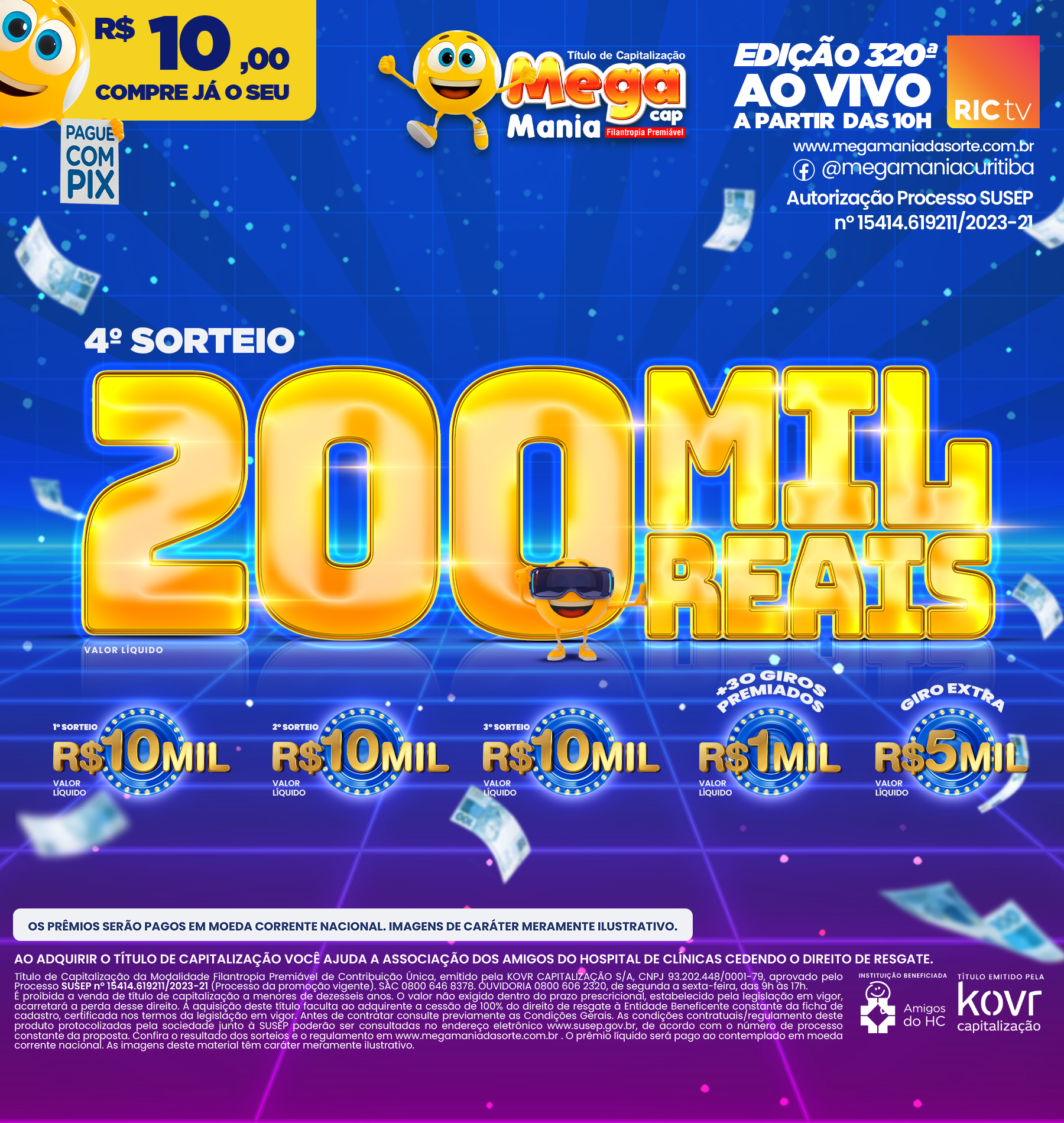 Sorteios decorrentes de Títulos de Capitalização de Pagamento Único, da Modalidade Filantropia Premiável, emitidos pela KOVR Capitalização. Você pode ajudar a associação dos amigos do hospital de clínicas comprando o Megamania Cap e cedendo o direito de resgate. A aprovação deste Título pela SUSEP não implica, por parte da Autarquia, em incentivo ou recomendação a sua aquisição, representando exclusivamente, sua adequação às normas em vigor. Antes de contratar, consulte previamente as Condições Gerais.